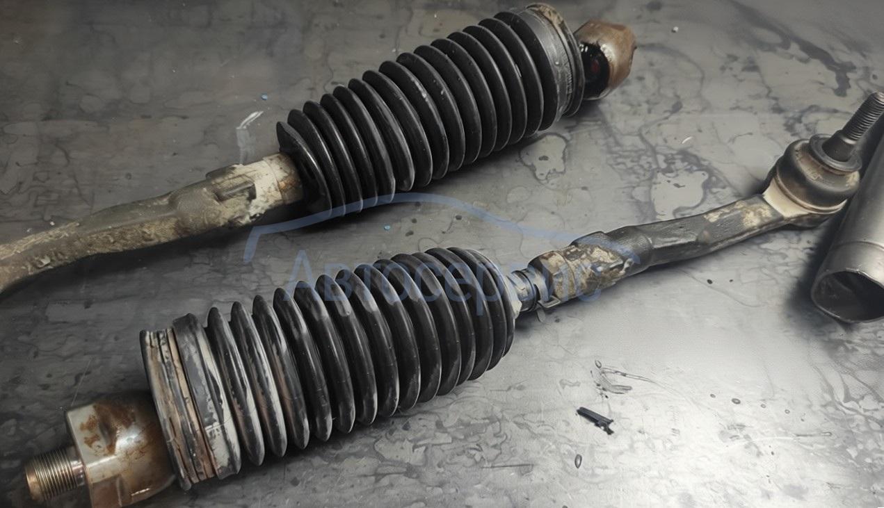 - При осмотре видны утечки масла из рейки, люфты рулевых тяг и другие дефекты.